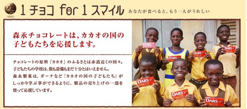 森永製菓が2008年から行っているのが「1チョコ for 1スマイルキャンペーン」。 バレンタイン直前の1ヶ月間に購入された対象チョコ1個につき1円をACEまたはプラン・ジャパンを通じて寄付し、カカオの国の子どもたちを笑顔にしていこうというわけです。