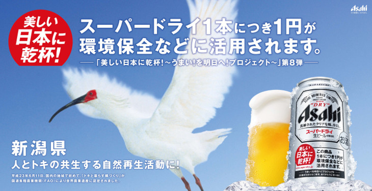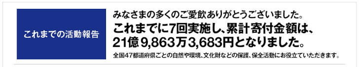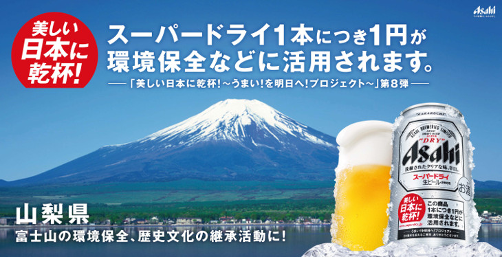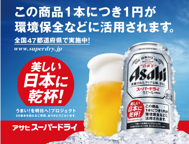 - アサヒビールドライ1本につき1円が47都道府県ごとに自然や環境、文化財保護のために寄付される(購入した地域に寄付)