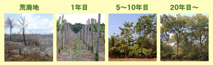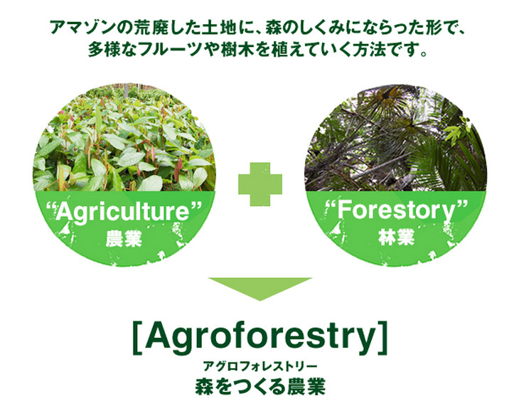 混農林業、森林農業ともいわれる。単一作物の栽培ですっかり荒廃したアマゾンの土地に、さまざまな果実、作物のなる多様な樹木を自然の森に近い状態で栽培することで森を再生する。まさに“森をつくる農業”。