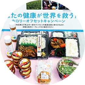 - TFTマークのついた対象商品の購入、サービス利用、イベント参加でカロリーをオフセット。売上の一部が開発途上国の給食や畑の設備費として寄付される