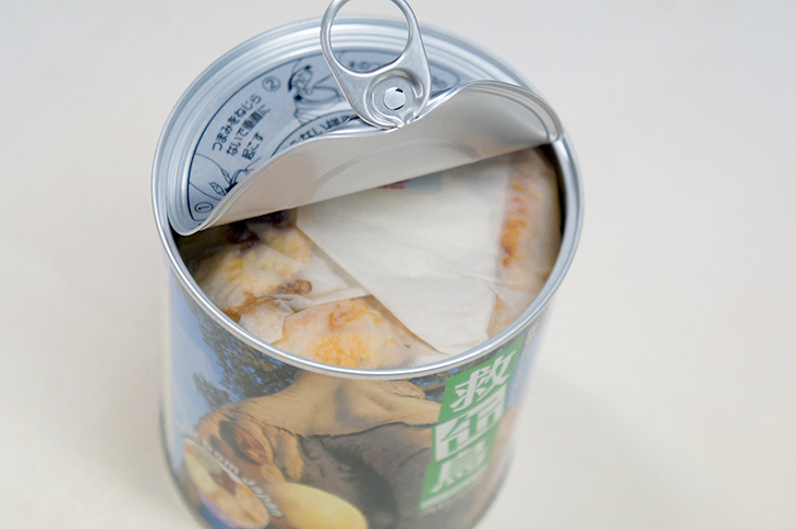 缶を開けると、紙に包まれた状態でパンが入っています。実はこの紙にも秘密があるんです。