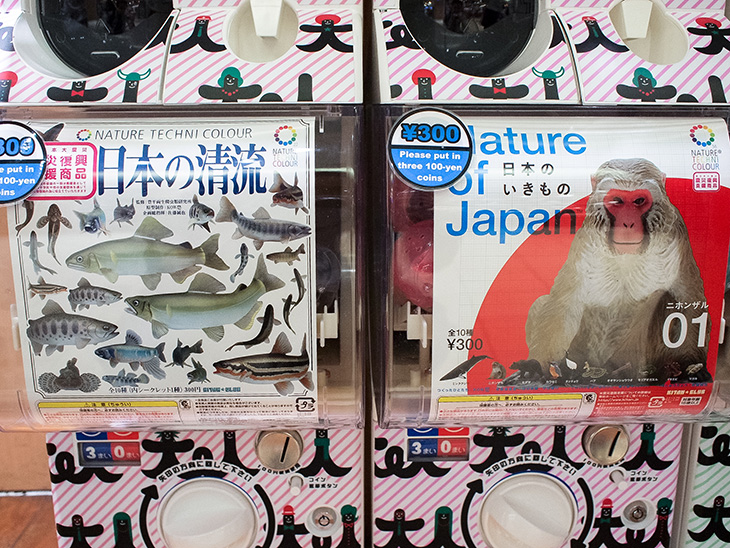 先日買い物をしていた時のこと、ガチャガチャの機械がたくさん並んでいるところを通りかかりました。見ると、「日本のいきもの」、「日本の清流」、「南極」、「サバンナ」などなど、生き物のフィギュアのようです。