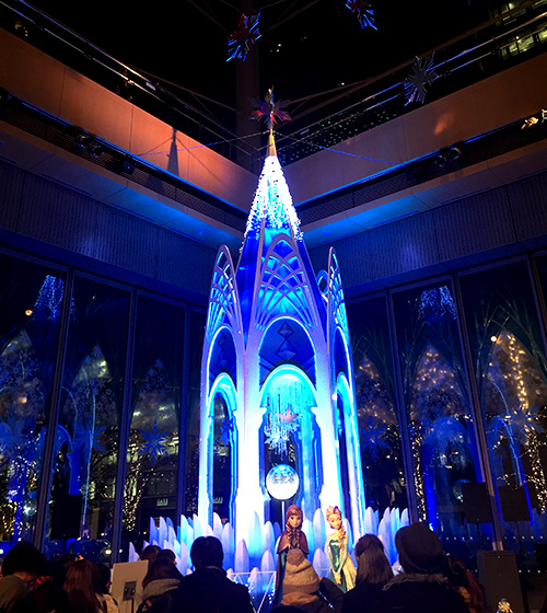丸ビル1階マルキューブには『アナと雪の女王』を題材にした約10メートルのクリスマスツリーが登場し、大人気。