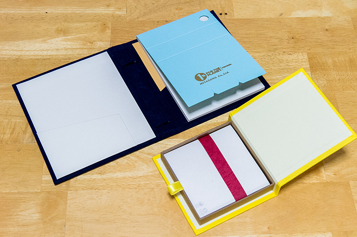 ミヤザワさんでは最近は無地のバナナペーパーの依頼も増えているそうです。企業はもちろん、個人やデザイナーなどからも注文があるとか。名刺、はがきやB4、A4などの定型サイズから大判まで、用途に合わせたサイズ、厚みのバナナペーパーを選べます。紙をお探しの時には、一度問合せしてみてはいかがですか。