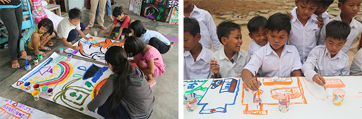 ワークショップは、海外ではクロアチア、ベトナム、カンボジアをはじめ9.11テロ後のニューヨーク、アフガニスタン、インド洋大津波の被災地、日本国内では小児病棟や児童養護施設などで行われています。じゃがビーのパッケージ裏面に描かれているのは、まさしくこのワークショップで描かれた絵なのです。