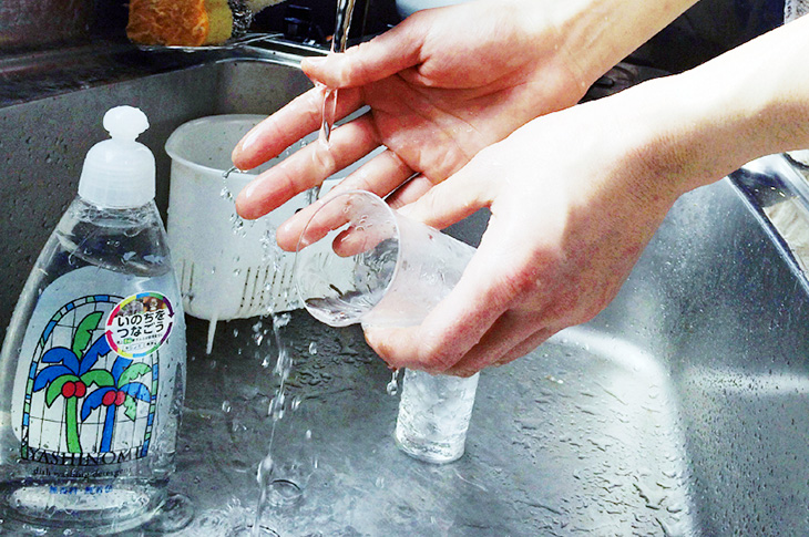 植物性洗剤によく使われるのがアブラヤシというヤシから採れるパーム油です。植物性だし、お肌にも環境にも良い原料です。そこで、手肌にも地球にもやさしいというこのサラヤのヤシノミ洗剤で、食器を洗ってみました。