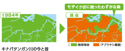 世界中でパーム油の需要が増えたおかげで…何と!熱帯雨林がどんどん減ってきたんです。世界のパーム油生産の8割を占めるのはマレーシアとインドネシア。その2つの国の間に位置するボルネオ島では熱帯雨林の減少が急激に進み、例えば北東部を500km以上に渡って流れるキナバタンガン川流域の30年前と現在とを比較してみると、森が激減した様子が一目瞭然です。