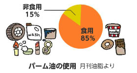 パーム油というと洗剤のイメージが強いですが、そのほとんどはインスタントラーメン、スナック菓子、マーガリンなどの食品に使われており85%が食用。残りの15%が食用以外の洗剤や化粧品などに使われています。