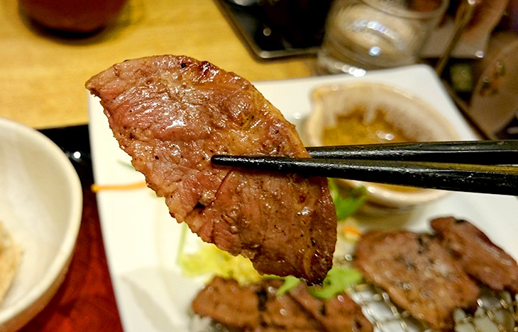 では、特製醤油だれに漬け込んで炭火で焼いたという牛たんをいただきまーーす。