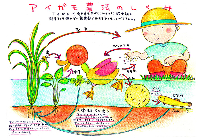 田んぼにアイガモを放つのですが、鴨さんが害虫や雑草を食べてくれるうえ、糞が田んぼの養分となるので、無農薬・無化学肥料かつ省力でお米ができるというよくできた環境保全型農法なんです!
