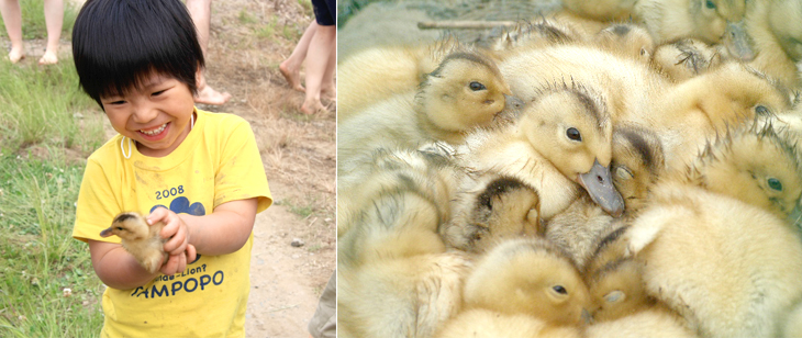 トラストのメンバーが田植えや稲刈りなどを体験したときの写真です。鴨さん、とってもかわいいですね!ピヨピヨ鳴くんですよ。