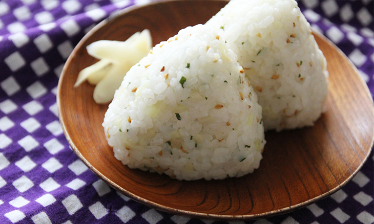 オススメの食べ方は、断然、新生姜お結びです。少し柔らかめに炊いたお米(2合)に新生姜の甘酢漬け(100g)を細かく刻んだものを混ぜ、お結びにして完成です。お米の甘さがより引き出され、まさに絶品!