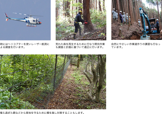 「森をつくる」ために、全国の森を訪れ、様々な分野の専門家とともに調査・研究を行い、地元の方々とも協力しながらプロジェクトを進めてきたそうです。荒れた森をどのようにして再生するか計画を立て、実際に間伐して光を入れて草を生やし土壌を回復させたり、植生の多様性を復活させたり、森という生態系全体を蘇らせる。一企業の活動としては破格と言ってもいいでしょう。