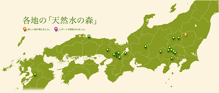 2003年から始まった「天然水の森」の活動は、2015年3月に「日光霧降」の森(下図のオレンジの位置)を新たに加えて現在13都府県18ヶ所、総面積はおよそ8,000ヘクタールにまで広がっています。これは明らかに工場で汲み上げる水よりも多くの地下水を生み出しています。
