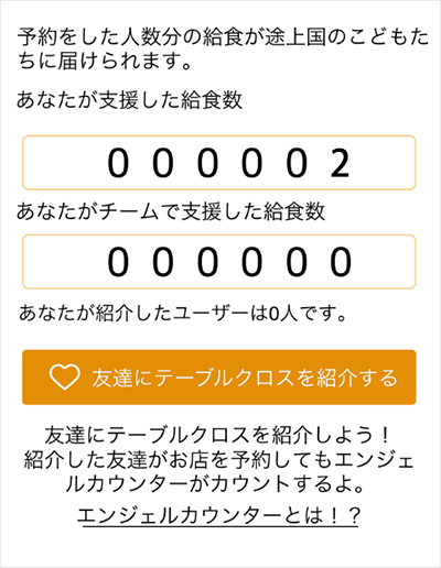 そして「エンジェルカウンター」が今まで届けた給食をカウントしてくれるんですね!今回は2人の予約なので、累計2になりました。これで予約完了!