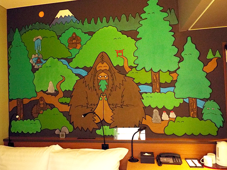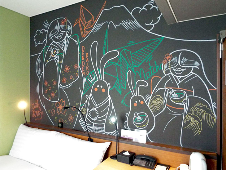 三部屋目は、Dan Kitchener(ダン・キッチェナー)による「The Lily Garden」です。「おお・・・」と感嘆とも驚きとも、若干戸惑うくらいの迫力です。彼はビールのHeinekenやコンバース、キリン一番搾りなどとコラボしたこともあるようです。けっこうパンチのあるユニークな絵だけれど、この作品のどこが“Lily”なのだろう・・・。スタッフさんによる「たこ焼きからイメージを膨らませたのでは」という説など、謎がいっぱいです。癒しなのか、挑戦なのか、とにかく心が揺さぶられます。ホテルの部屋にこんな作品を描いてしまうチャレンジ精神に脱帽です。