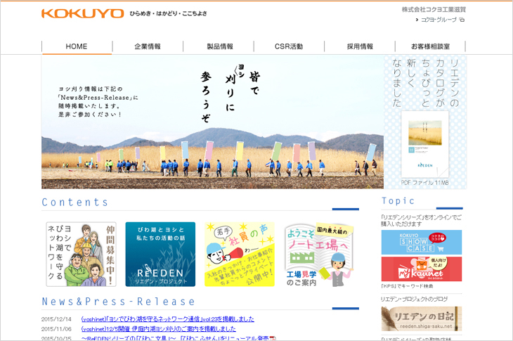 ヨシは夏場に成長し二酸化炭素を吸収し、群落は魚の産卵場所にもなるなど、琵琶湖の水環境・生態系保全のために必要不可欠な植物で、このヨシを「刈る→作る→使う」というサイクルで活用しているのが、コクヨグループのコクヨ工業滋賀(本社・滋賀県)です。このプロジェクトは「REEDEN(リエデン)」プロジェクトと命名され、さまざまな文房具を発売しています。