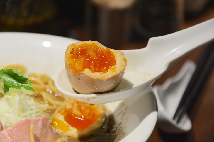 そして、お待ちかねの煮玉子。箸で二つに割ると、黄金色の光を放っています。しっとりとした食感が楽しめる半熟です。頬張るとタレのほのかな甘みと黄身の濃厚さがとてもよく合います。