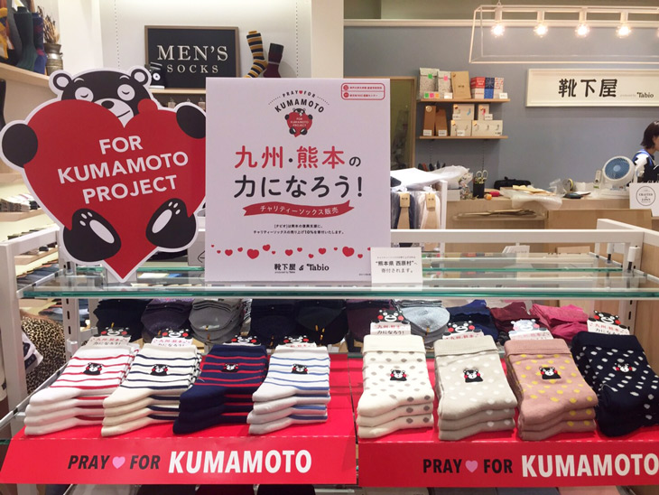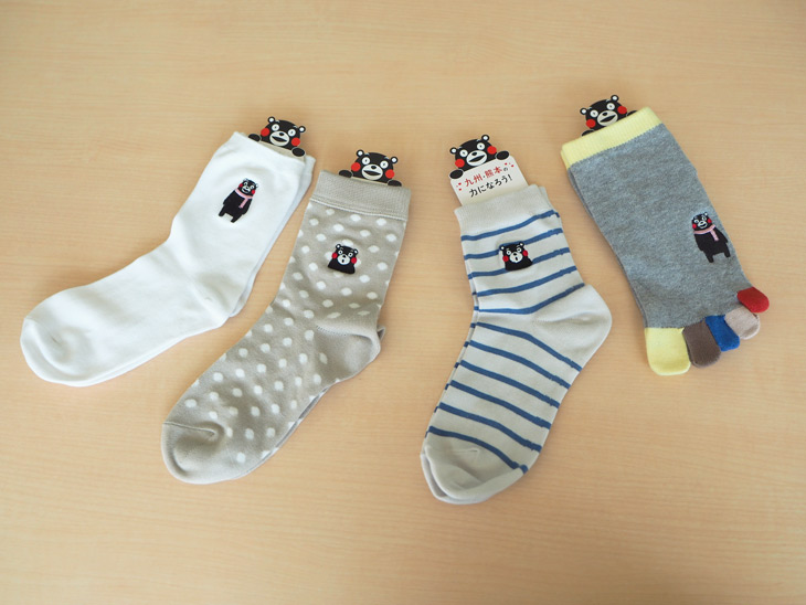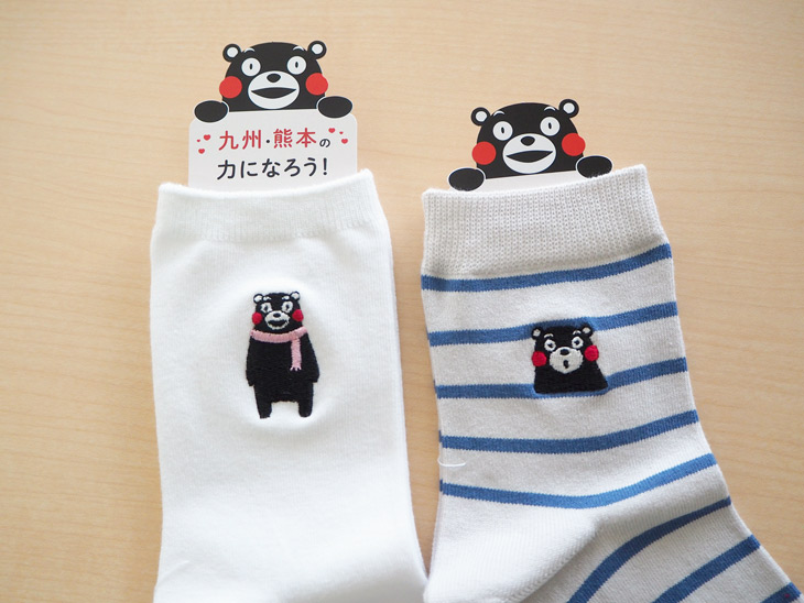 「くまモン」刺繍の入ったチャリティーソックスの売上から10%が、熊本県西原村へ寄付される仕組みです。