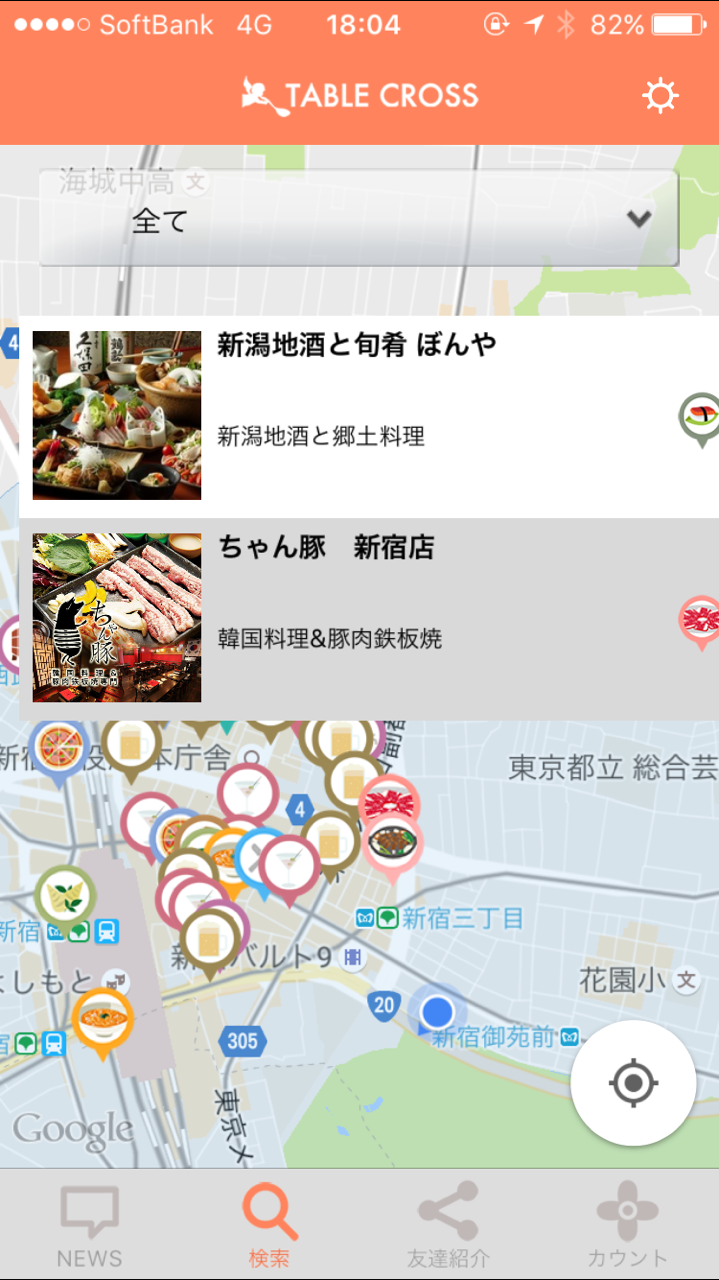 ”マップから探す”を使うと、現在地から近いお店を探すことも可能です。ノリで行くことになった2軒目も、その場でスマートに探すことができますね。