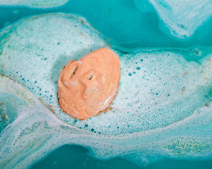 バスタブに入れると、つるっとしたゴールドの外殻が泡立って消え、落ち着いたブルーの湯船に隠れたメッセージが現れます。