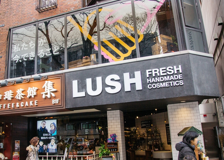 ラッシュ原宿表参道店のウインドウには、「ハンズ オブ フレンドシップ」のステッカーが大きく貼られている。