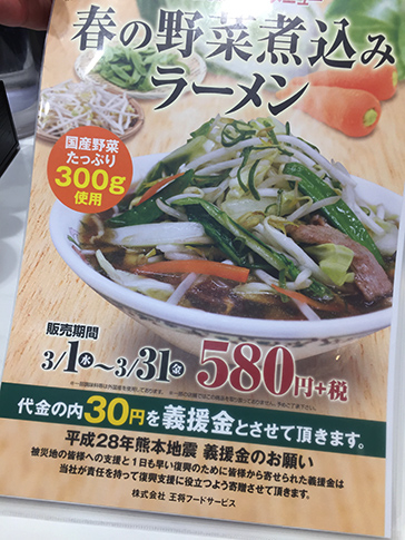 ちなみに、『春の煮込み野菜ラーメン』は全国の餃子の王将で販売されている。そのうち、宮城県内の店舗のみ、東日本大震災の復興支援金に使われるそうだ。忘れてはならない記憶への配慮もこまやかに。餃子の王将、さすがである。