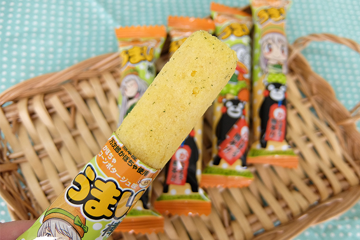 その名も「くまモンうまい棒」かぼちゃコーンポタージュ味