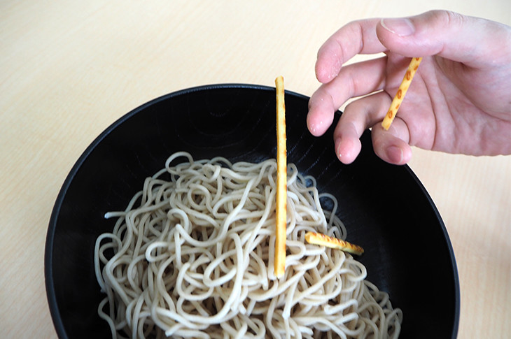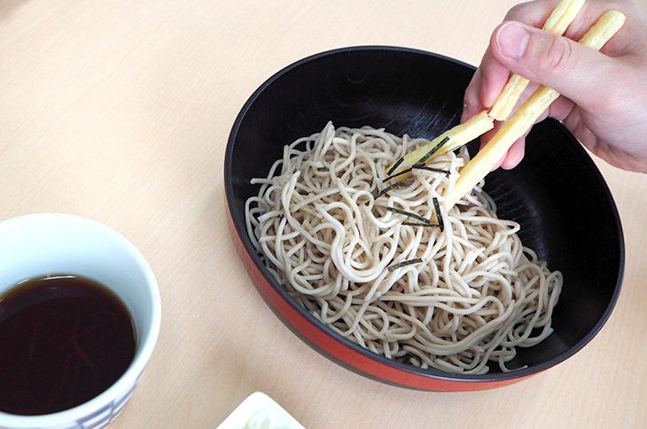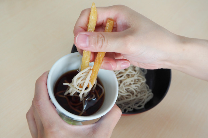 長さも足りないのでつゆの底に落としたそばには届きません。