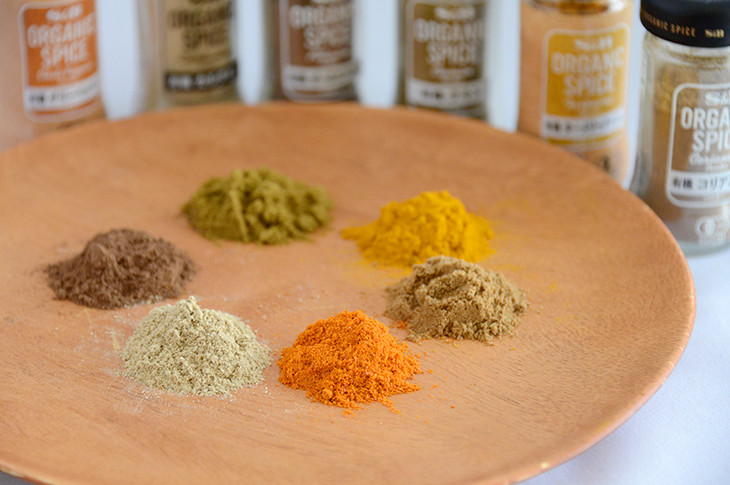 主に香りをつける「クミン」「コリアンダー」「カルダモン」「オールスパイス」、色をつける「ターメリック」、辛みをつける「チリーペッパー」の6種類の組み合わせ次第で、さまざまなカレーが楽しめるようです。この6種類で、本当に美味しいカレーになるのかしら…とちょっと不安です。