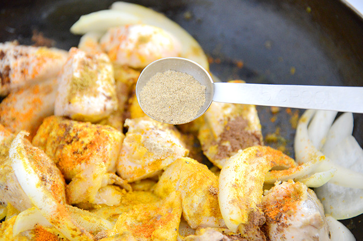 鶏肉と玉ねぎを炒めたところに、スパイス各種を入れて全体に回るように炒めて水とコンソメで10分程度煮ます。