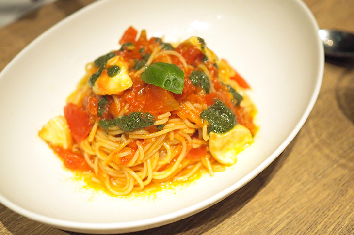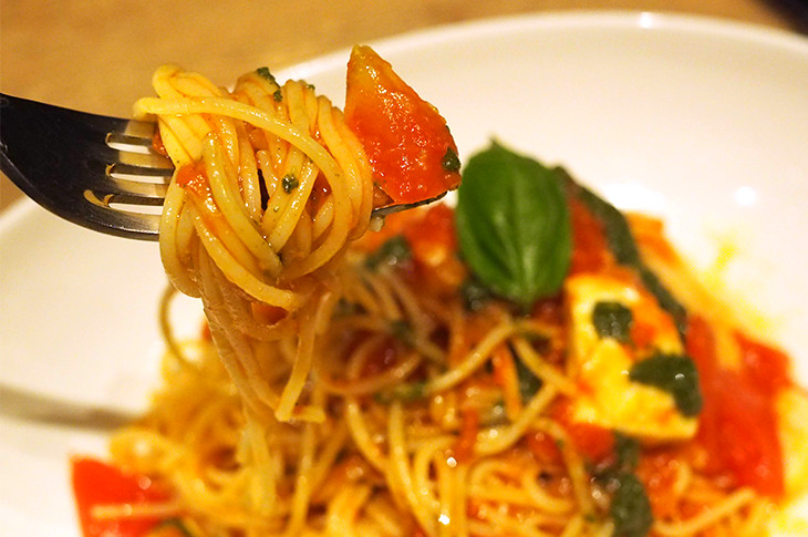 一口食べて思うのは、パスタがしっかりとアルデンテだなあということ。 コシのある細いパスタにトマトソースがしっかり絡んでくれるので、さっぱりしているのに食べ応えがあります。