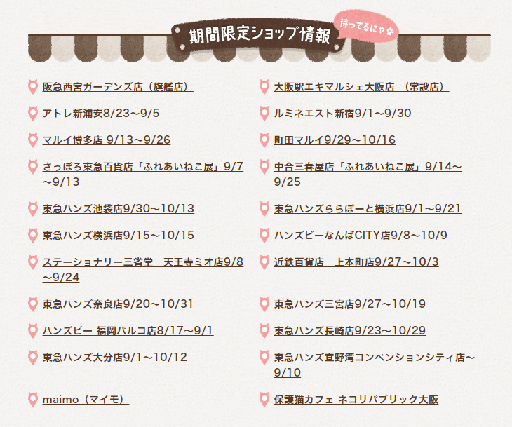 阪急西宮ガーデンズ店、エキマルシェ大阪店(大阪駅)などの常設店舗のほか、期間限定ショップが毎月いろんなところでオープンしているので最新情報はフェリシモ猫部のサイトをチェック!来月はあなたの街にもフェリシモ猫部がやってくるかもしれませんよ。