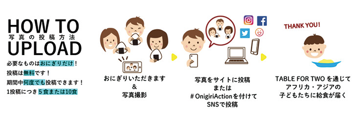 おにぎりの写真を撮って、 特設サイトまたは、ハッシュタグ(#OnigiriAction)を付けてSNS(※)に投稿するだけ。 写真が一枚投稿されるごとに、参加者に代わって、協賛企業から100円(給食5食分)が世界の子どもたちにプレゼントされる仕組みです。