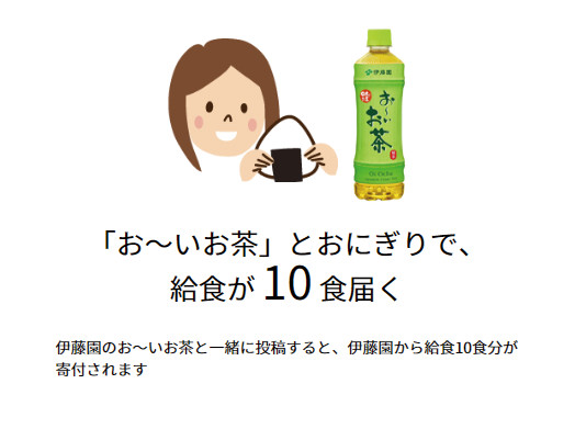 お~いお茶とおにぎりを一緒に撮るだけでなんと+5食(計10食)の学校給食を届けることが出来ます。