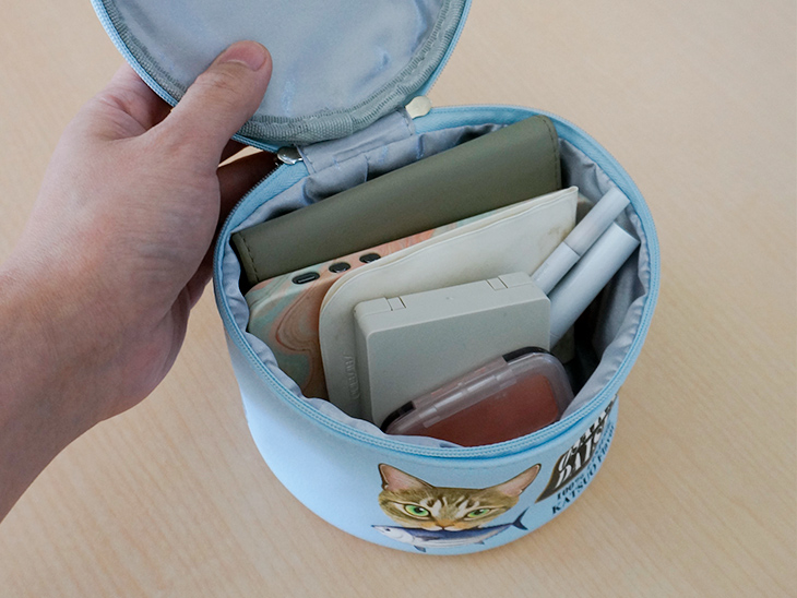口が大きく開くのも、探し物がすぐ見つかりそうで好印象◎ 横長のコンパクトも、アイライナーペンシルも余裕で収まりました。