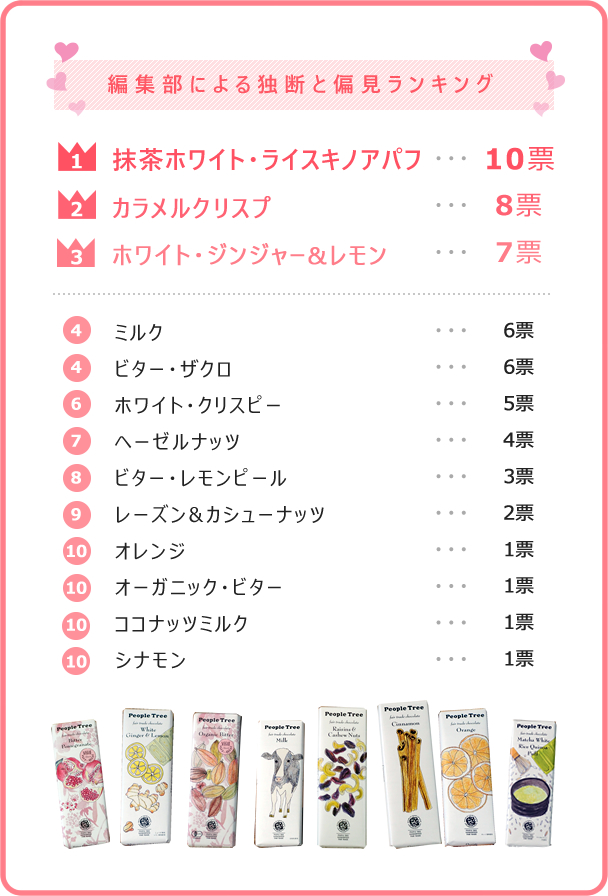 トップ3はピープルツリーらしさ全開!他では味わえない個性的なフレーバーはあと引く美味しさ!「さすが美味しいものを知ってるね」感が満載です!