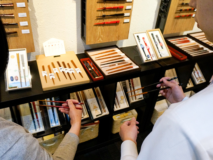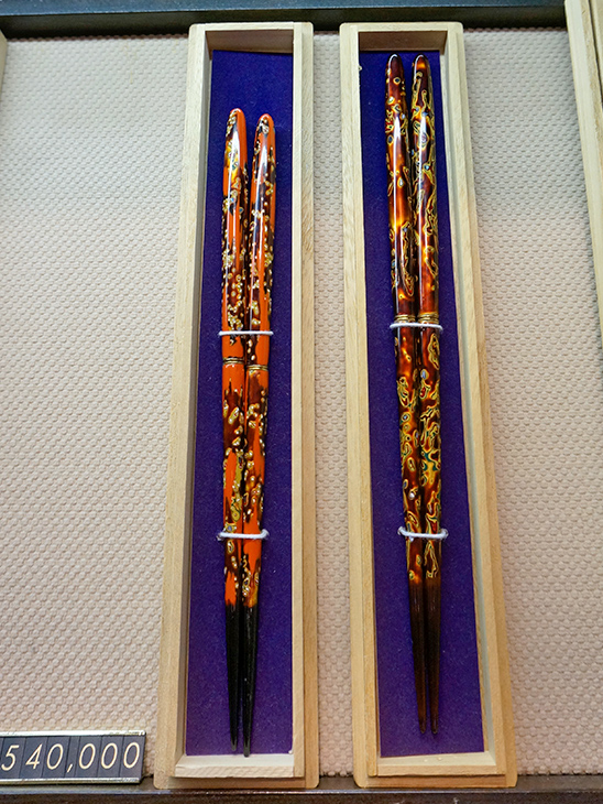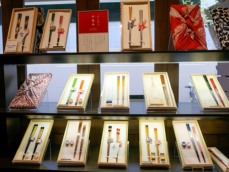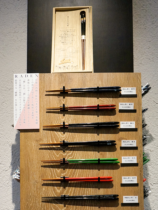 こちらは人気のある、貝殻を型抜きして貼り付けた「螺鈿(らでん)」のお箸コーナー。