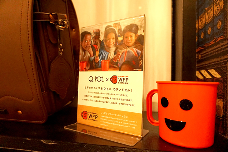 「Q-pot.ランドセル」の売上の一部は国連WFPのレッドカップキャンペーンを通じ、子どもの栄養状態を改善すると同時に教育の機会を広げる「学校給食プロジェクト」に寄付される。