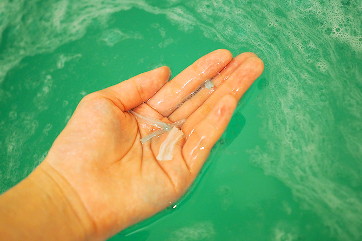 LUSHのバスボムのなかには、花びらやハートなどのかわいらしいトッピングが入ったものがあります。なにか出てくること自体は珍しくはないのですが…なぜ糸寒天なんでしょう…?