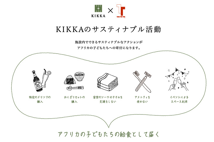 「サスティナブル」とは、持続可能な仕組みを指します。 KIKKAは、TABLE FOR TWO(TFT)とのコラボレーションにより宿泊施設全体を通じて寄付ができる仕組みになっています。