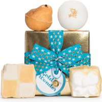 4種類のラメがきらめくバスアイテムをセレクトした数量限定ギフトです。 ローズやオレンジの華やいだ香りやクリスマスケーキを思わせる美味しい香りに包まれたバスタイムが楽しめます。なんて贅沢なんでしょ!