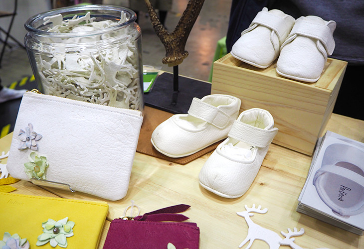 害獣として駆除されたシカやイノシシ、クマのなめしを行っているPortierra(ポルティラ)のブースでは鹿革でできたかわいいベビーシューズも…!