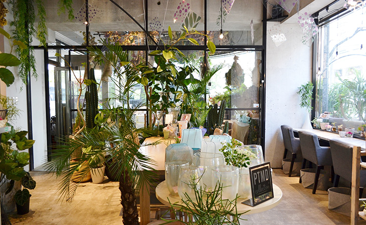 コンクリート打ちっぱなしの店内は、東京でひとり暮らしをしたらこんな家に私は住むんだ、という10代のわたしの願望というか妄想を絵に描いたような都会的でスタイリッシュな空間ですが、お花屋さんとカフェが併設されているので緑が多くてとても癒される空間になっています。