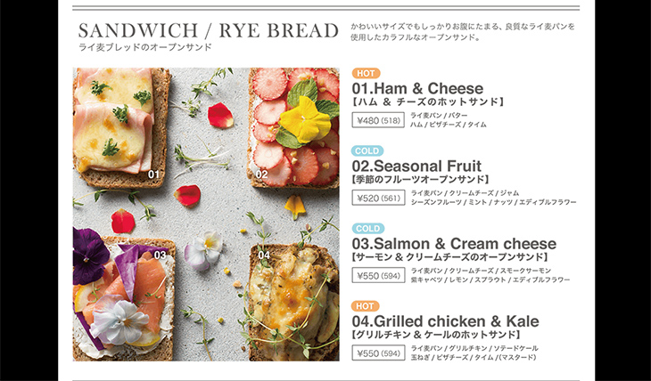 その他にも、一番人気の季節のフルーツや、ホットサンドのハム&チーズ・グリルチキン&ケールもありますよ。どれもおいしそう!