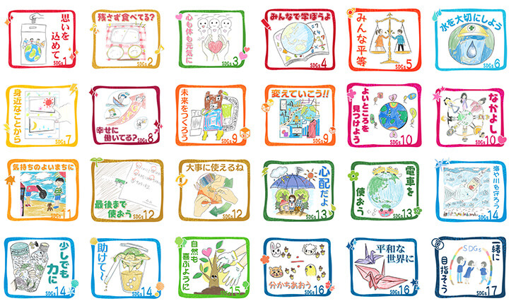 「SDGs LINEスタンプコンテスト」は、SDGsのコンセプトを表現したLINEスタンプを通じて、人と人とが繋がりあい、SDGs への理解を深め、具体的なアクションへと繋げることを目的に開催されました。小中高校生を対象に、SDGsをテーマに募集したイラスト2,411点のうち、審査を通過した受賞作品24作品をスタンプ化しました。