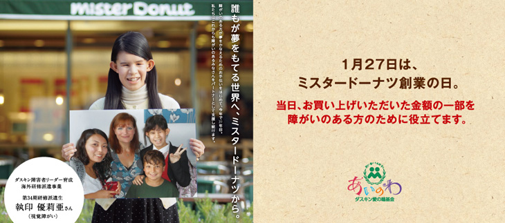 当日ミスタードーナツ店舗で商品を購入すると、その売り上げの一部が、障がいのある方の自立と社会参加を支援する「ダスキン愛の輪基金」に寄付できてしまうのです!