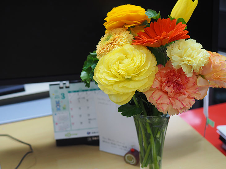 編集部に戻って早速お花を飾ってみました!パッとオフィスが華やかになって、眺めているだけで元気がもらえます。