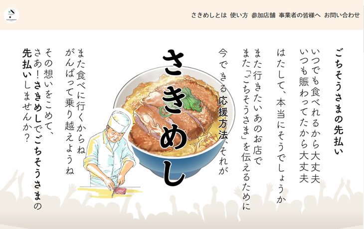 応援したい飲食店に飲食代を「先払い」しておき、落ち着いた頃にお店に食べに行く、というありそうでなかったサービス。